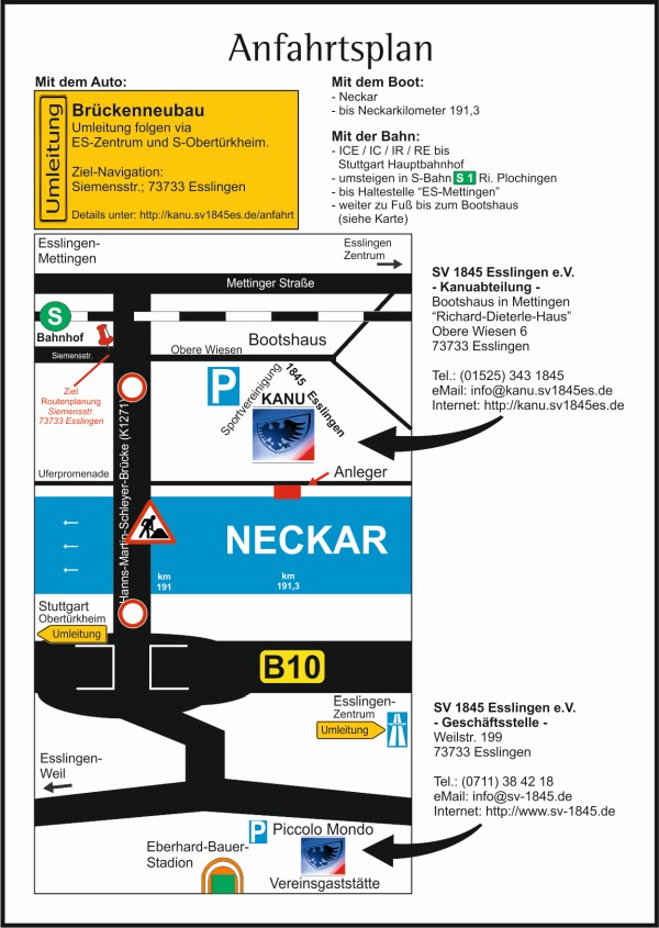 Karte und Routenplaner: Aufgrund des Ersatzneubaus der Hanns-Martin-Schleyer-Brücke ist die direkte Verbindung zwischen Hauptverein/Eberhard-Bauer-Station und Bootshaus und zwischen Bundesstraße B10 und Bootshaus gesperrt. Da unser Bootshaus an einem Feldweg steht, müssen folgende Daten zur Routenplanung verwendet werden: zum Ausdrucken eignet sich folgender Plan: ![]() |